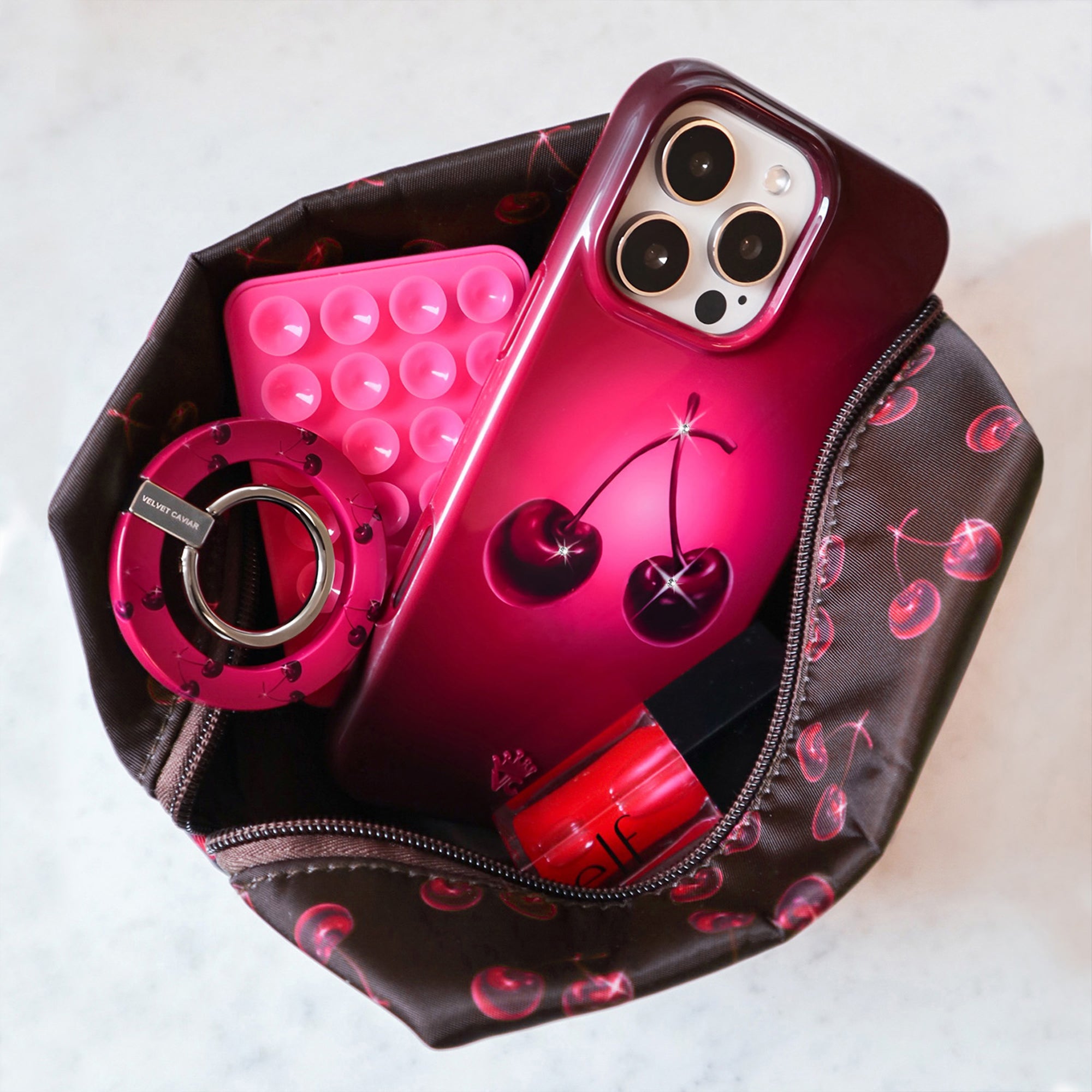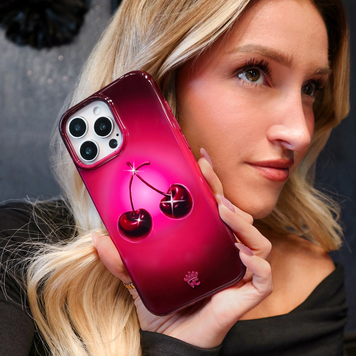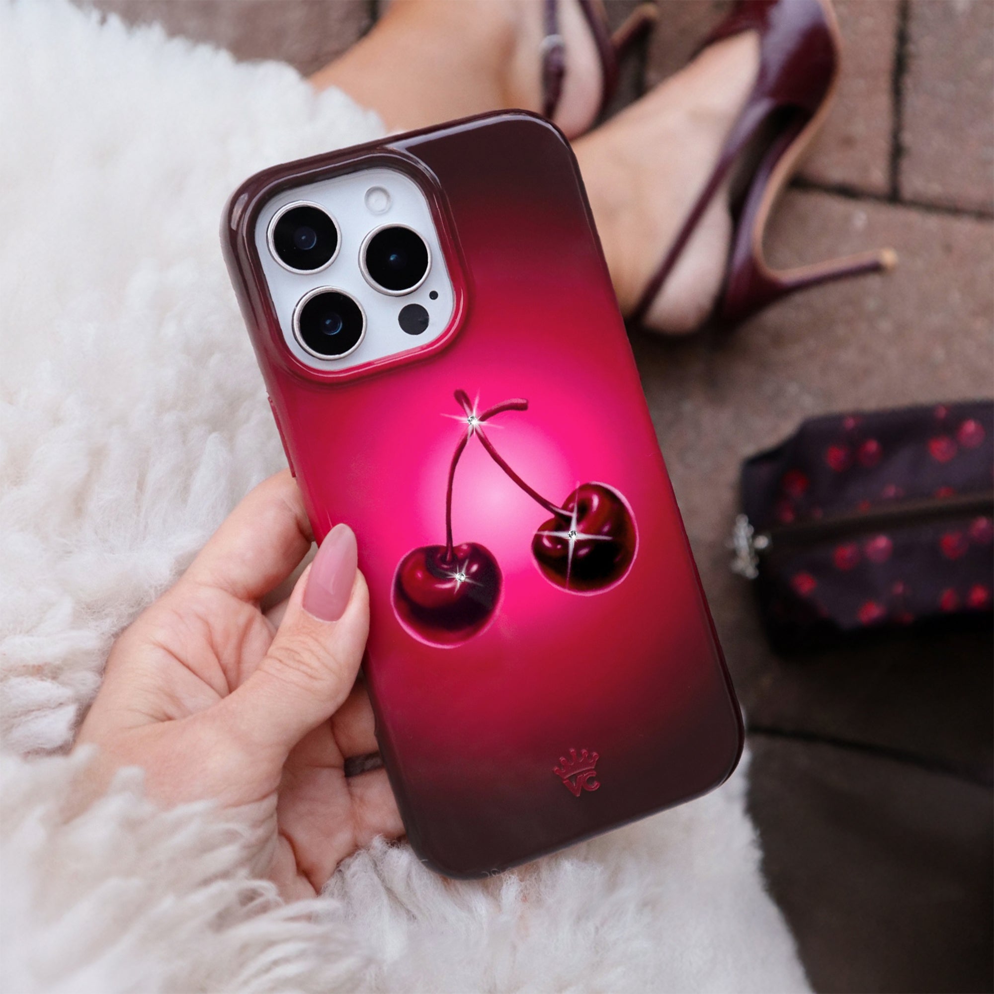 Holiday Exclusive! This MagSafe Black Cherry Case features 3 inlaid sparkling glass crystals on a stunning gradient burgundy base.