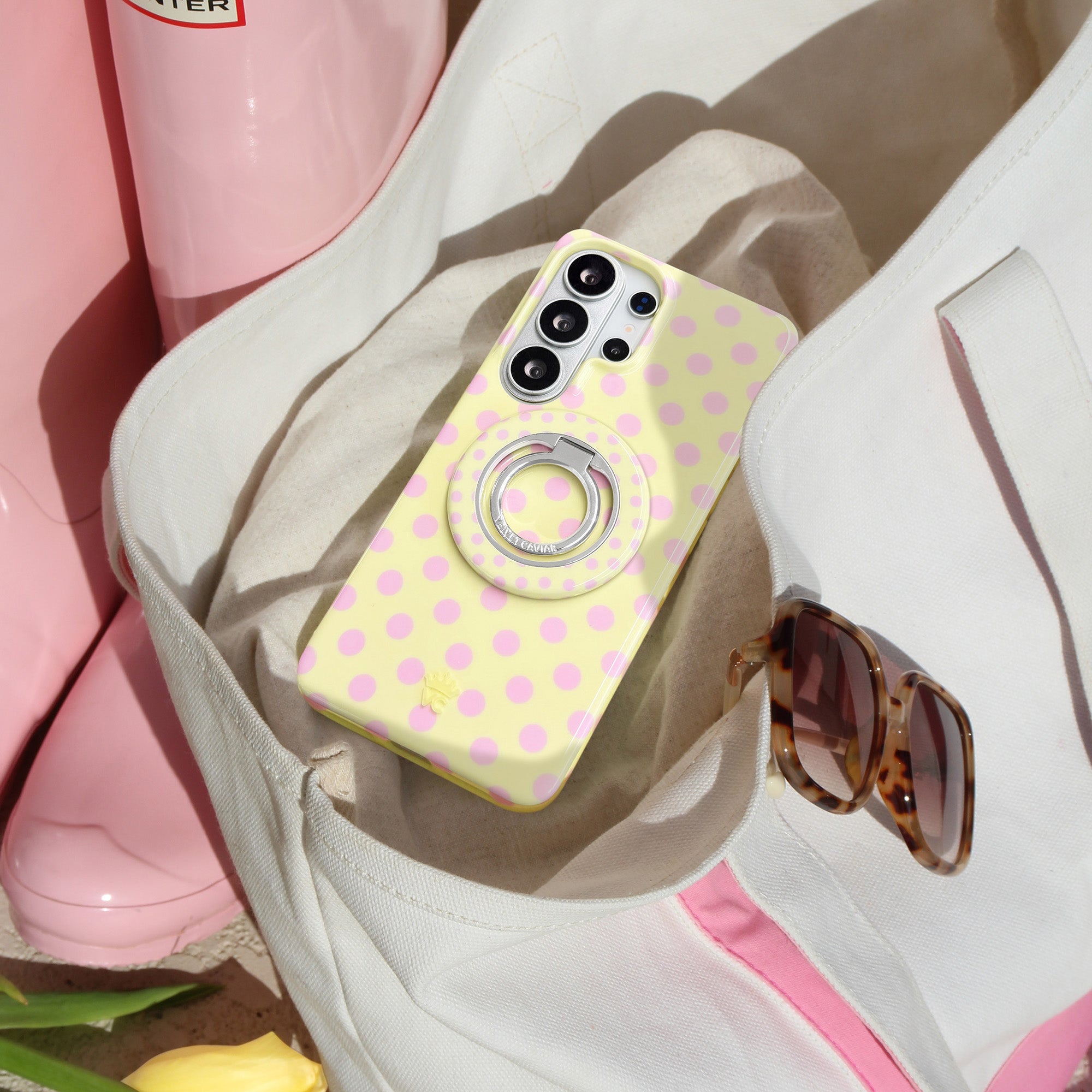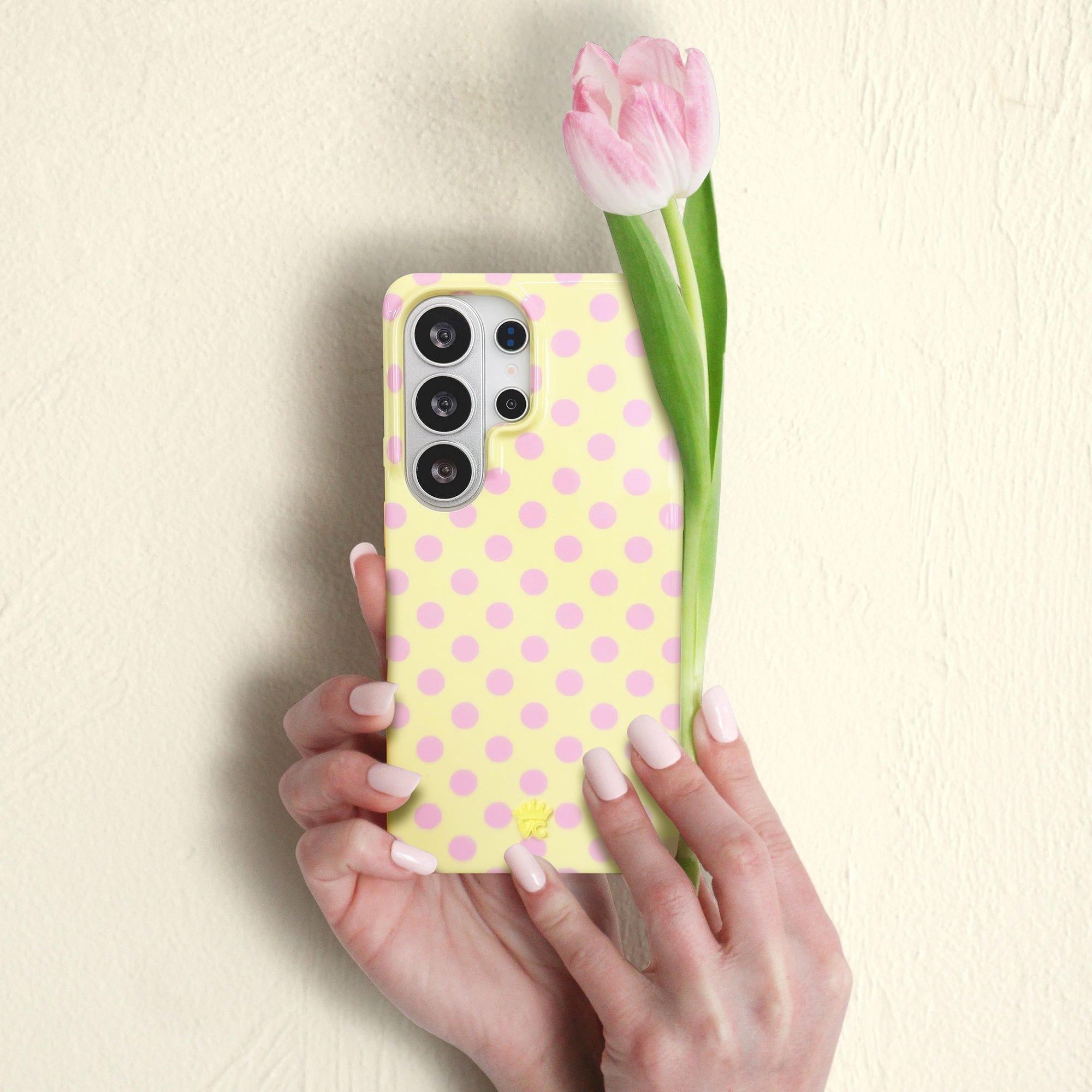 Playful and posh! This simple protective case features trending pink polka dots on a butter yellow base.