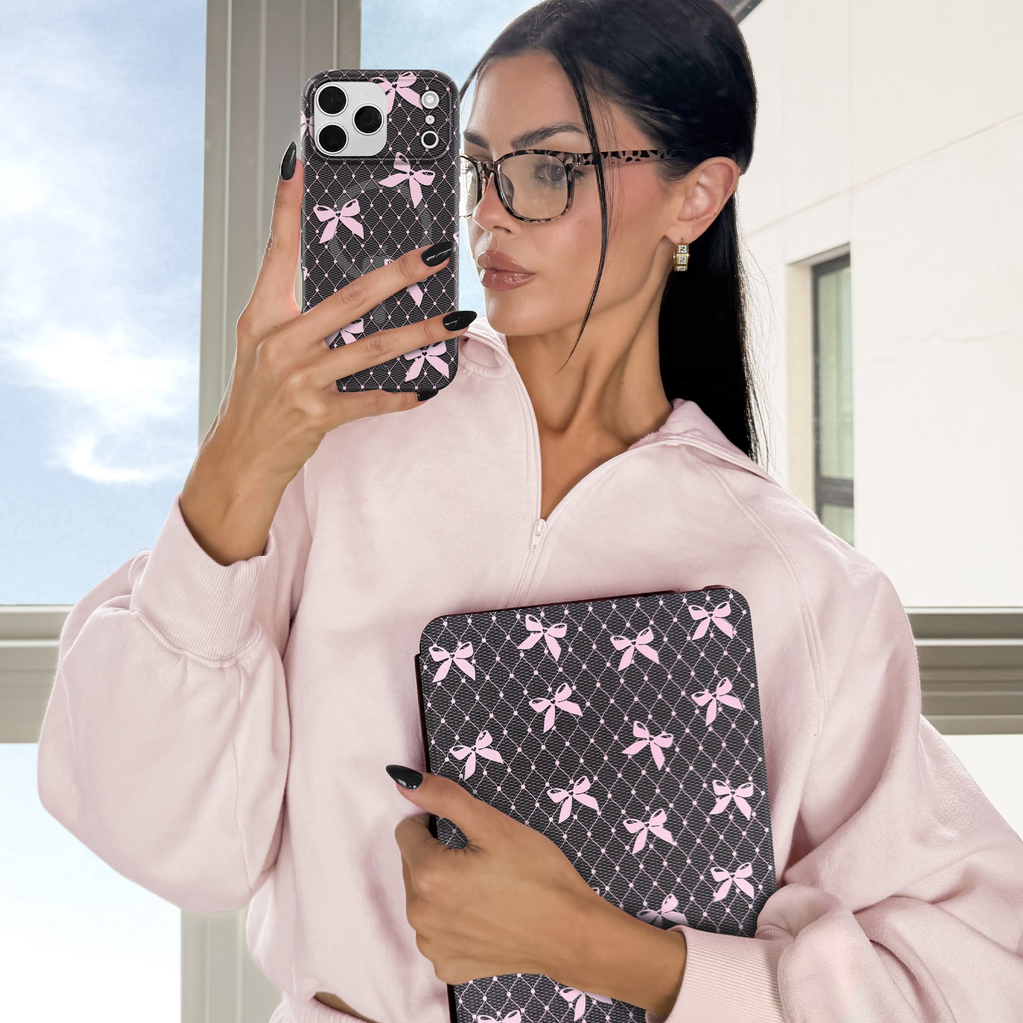 Elevate your everyday with this folio style iPad case featuring a Vegan Saffiano Leather exterior, 3 adjustable stand settings, and a charging compatible stylus holder*.