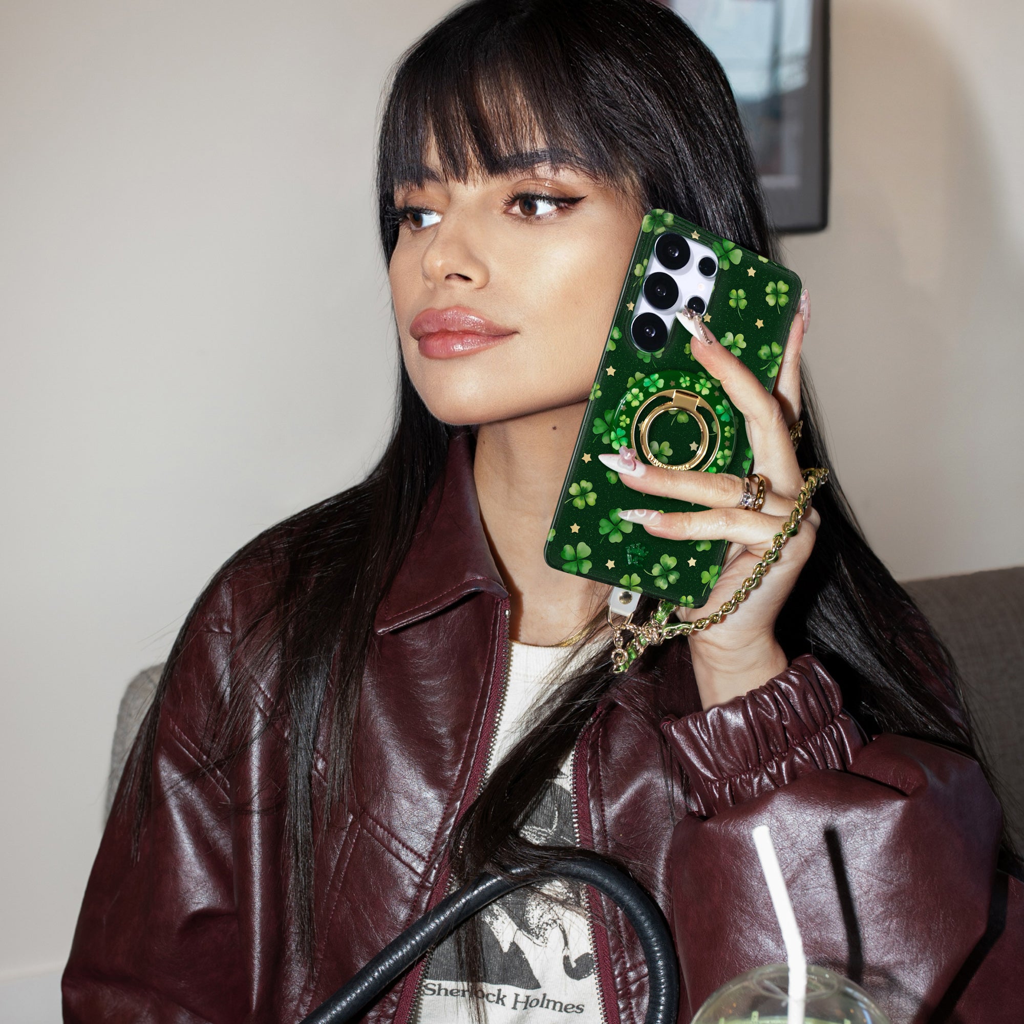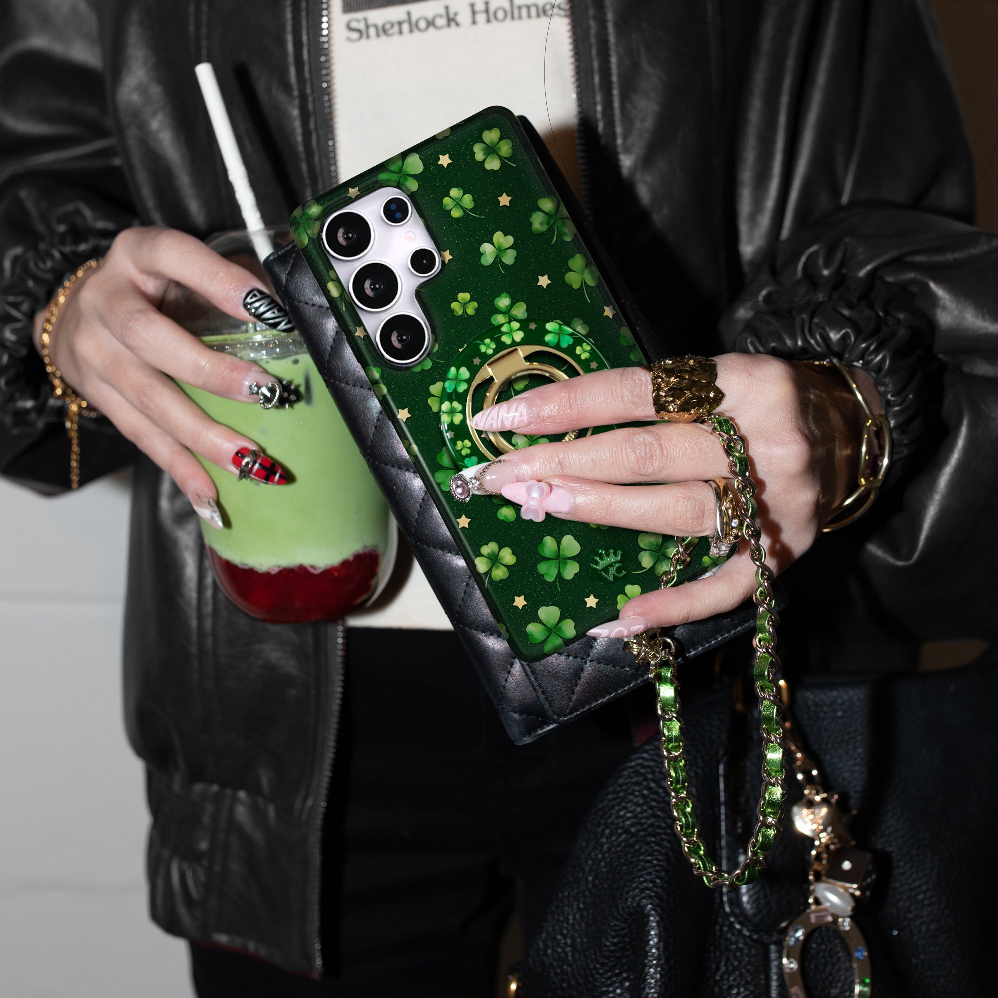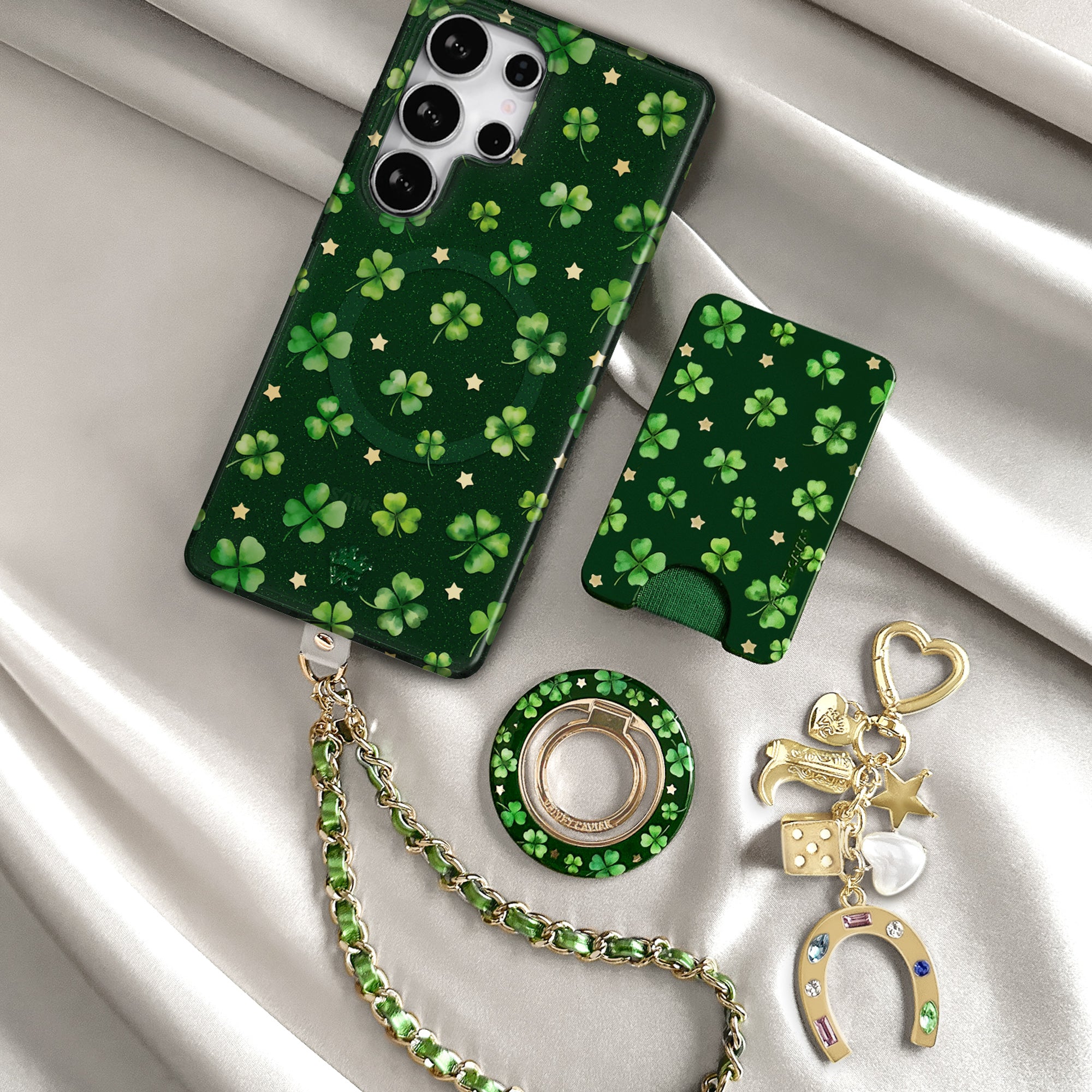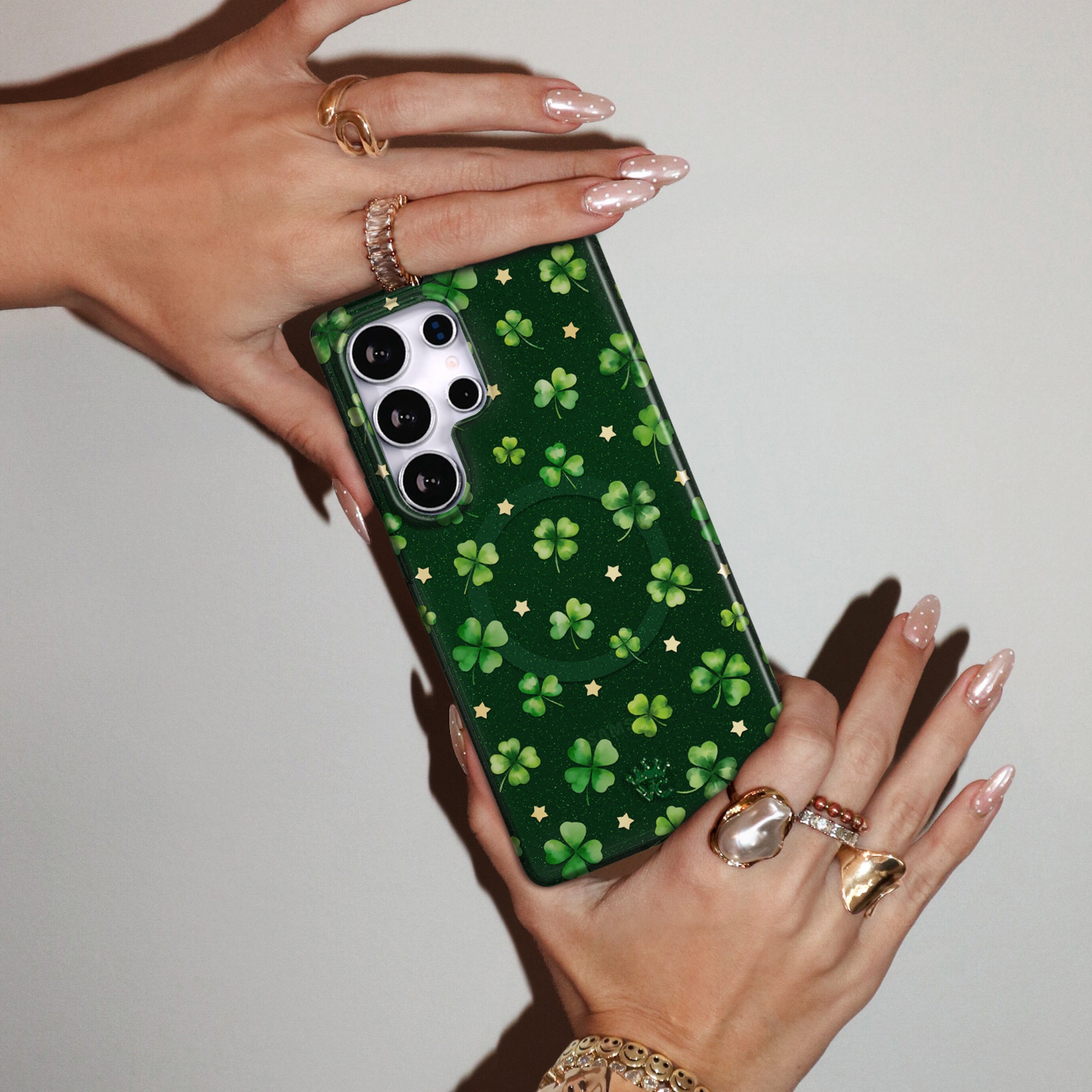 Happy St. Patrick's Day! This Limited Edition case features lucky four leaf clovers and gold chrome stars on a transparent emerald green base with green glitter sprinkled into the base and bumper.