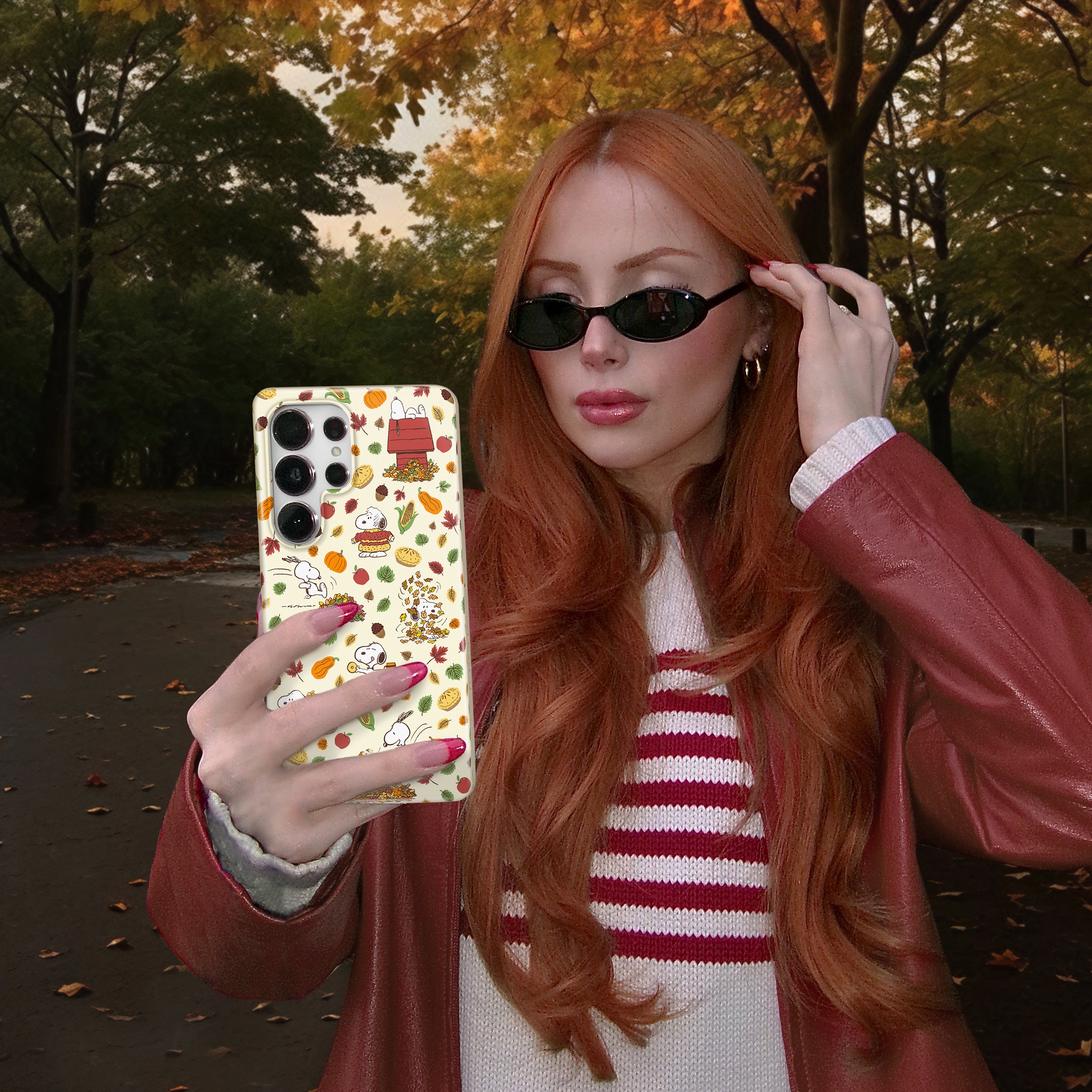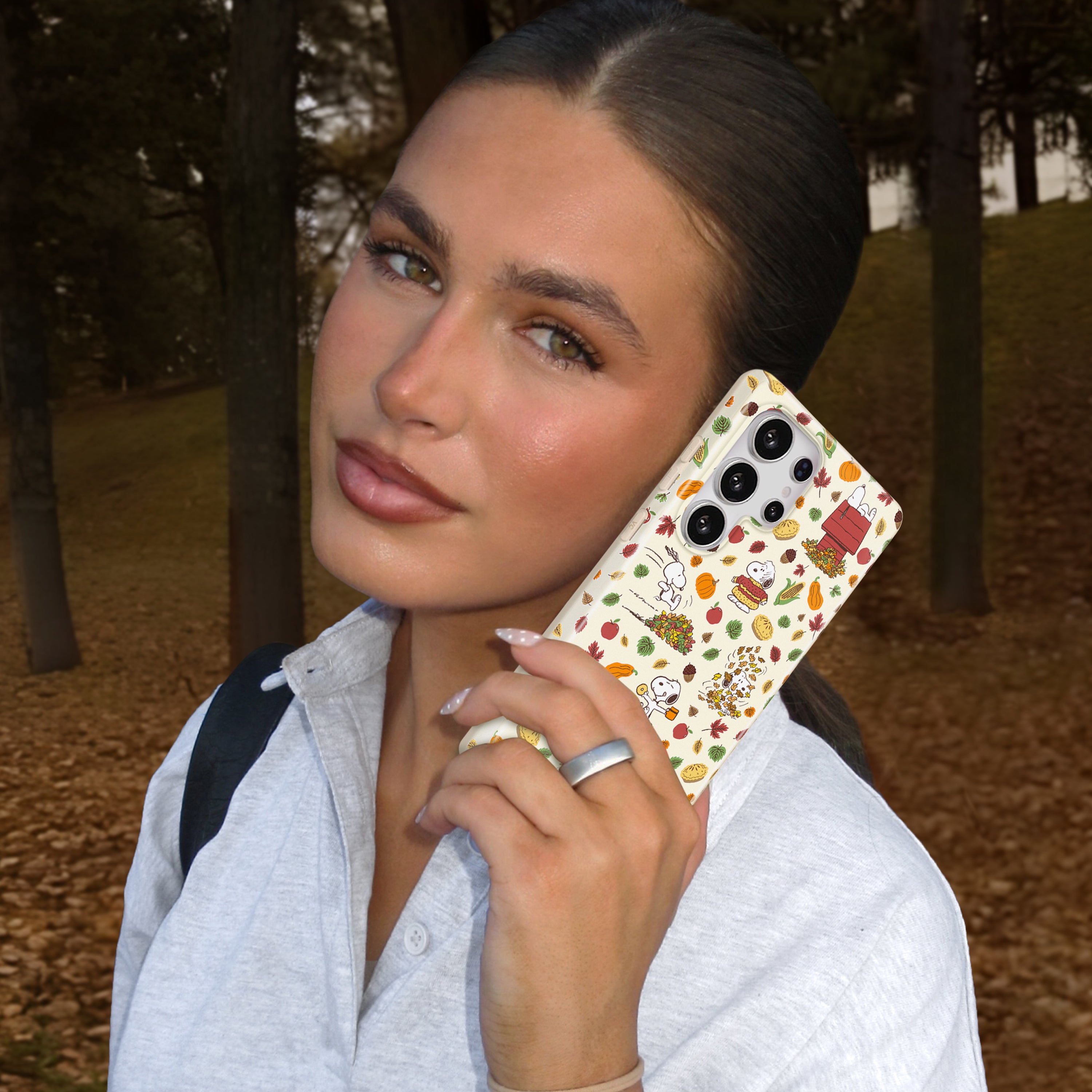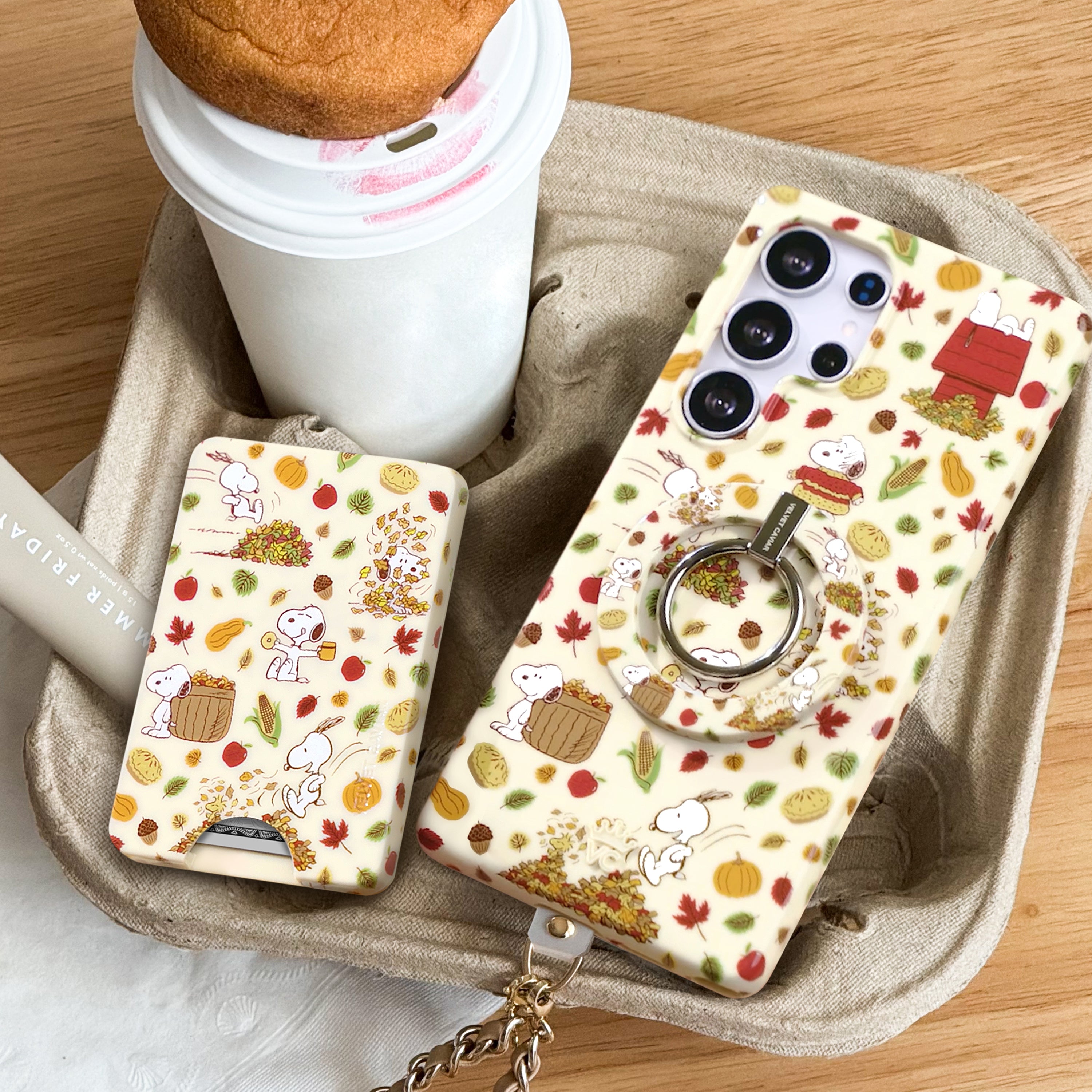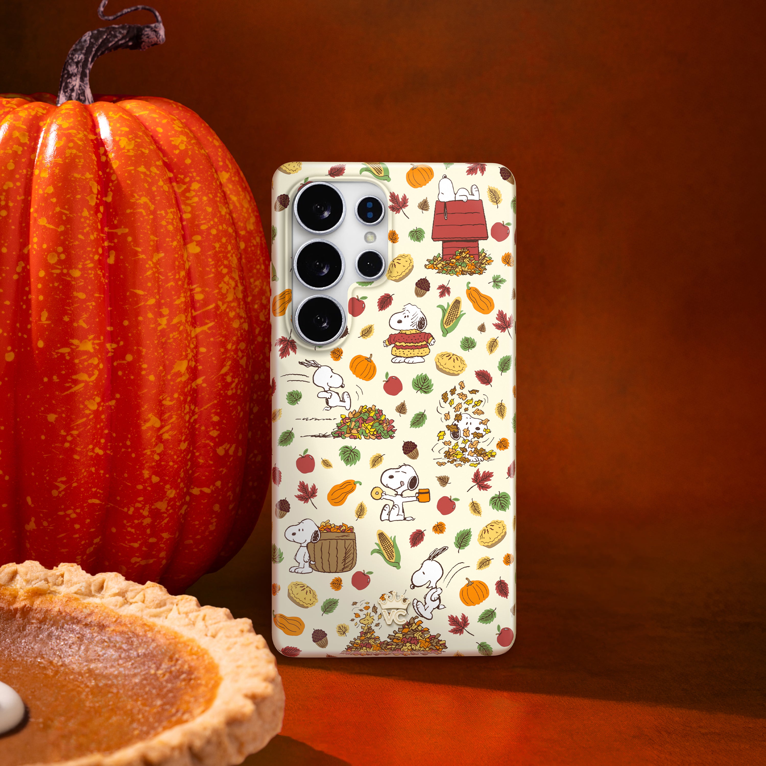 VC loves Snoopy! This neutral beige protective case features Snoopy celebrating autumn, with leaves, acorns, and autumnal foods throughout.
