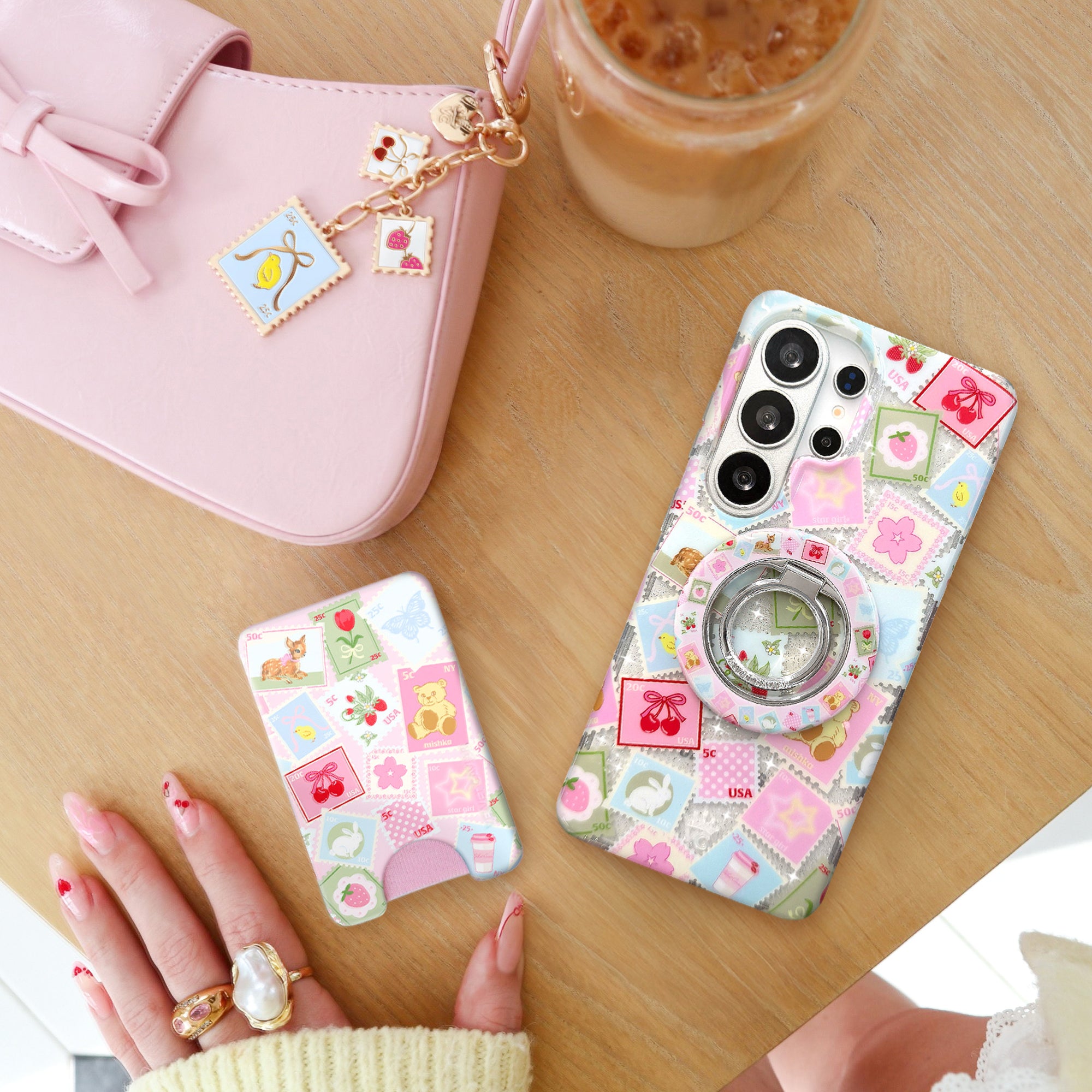 Stamped with love! This protective phone case features pastel spring stamps on clear case with silver glitter sprinkled into the base and bumper.