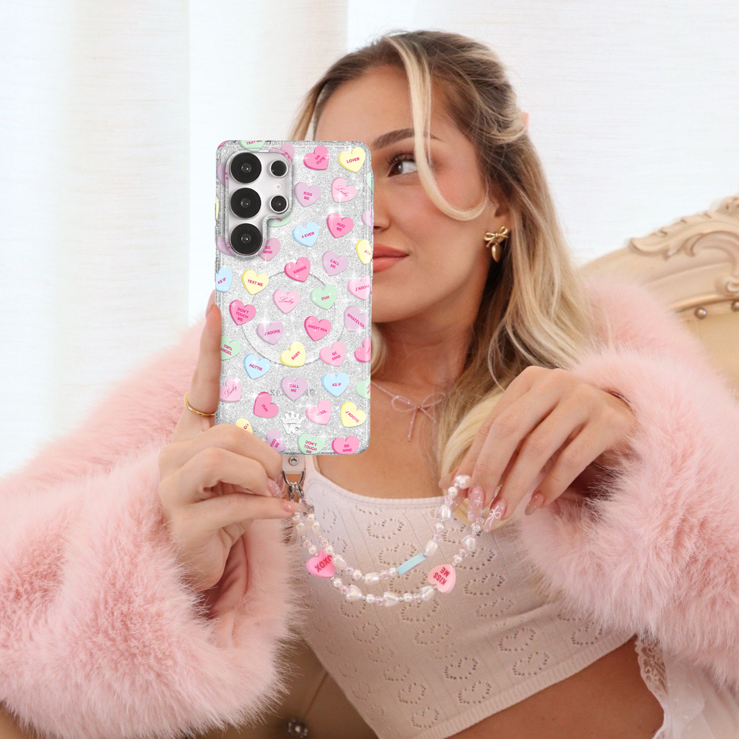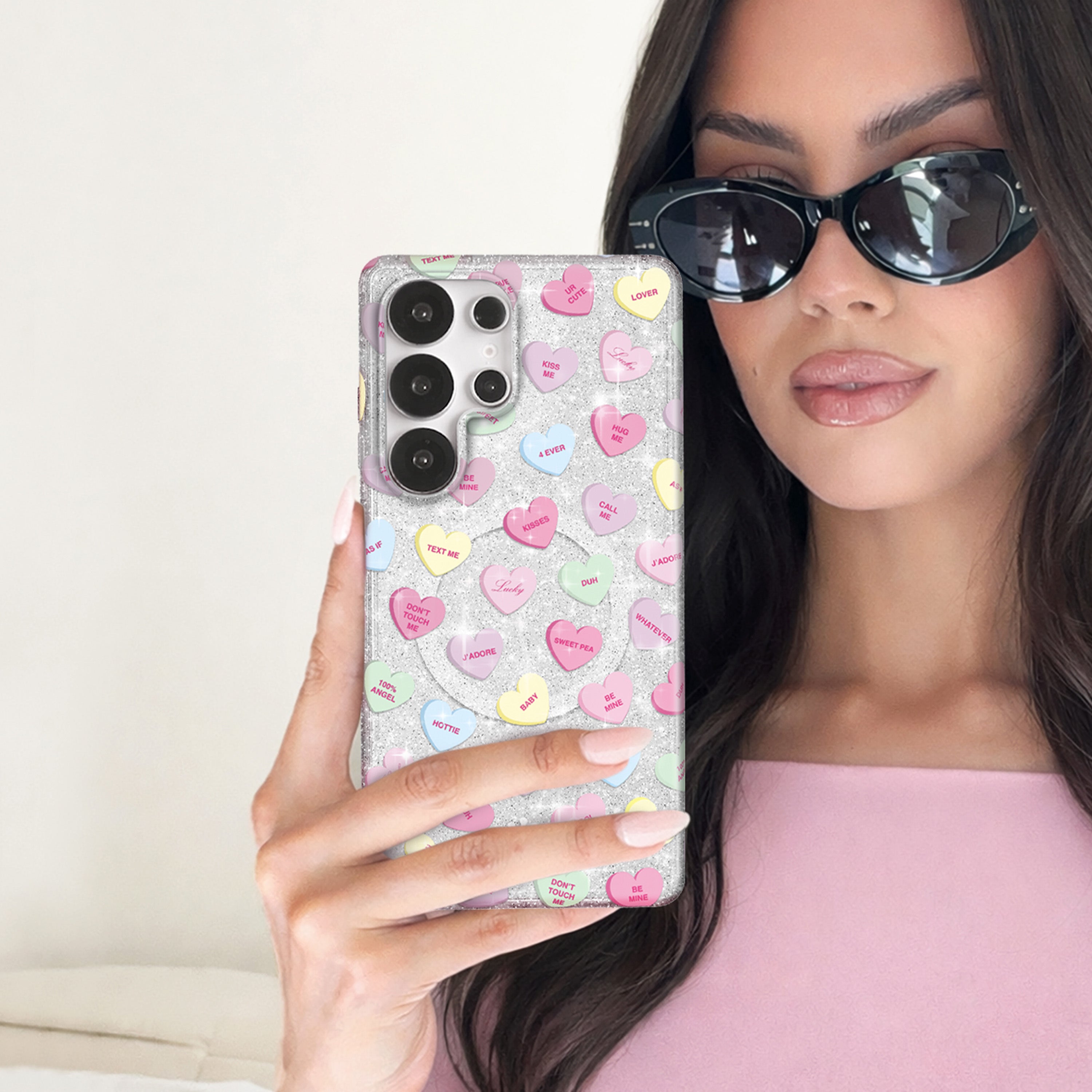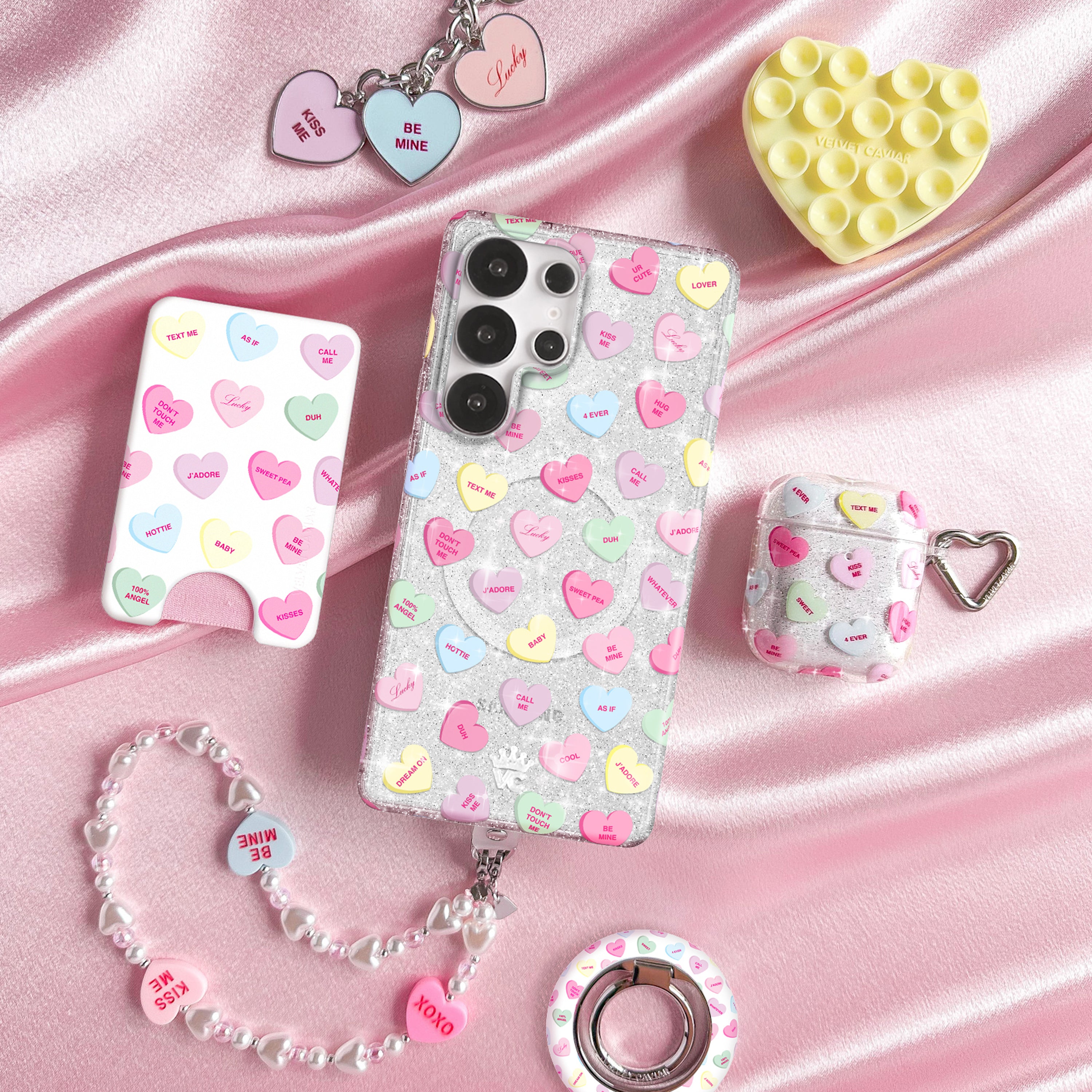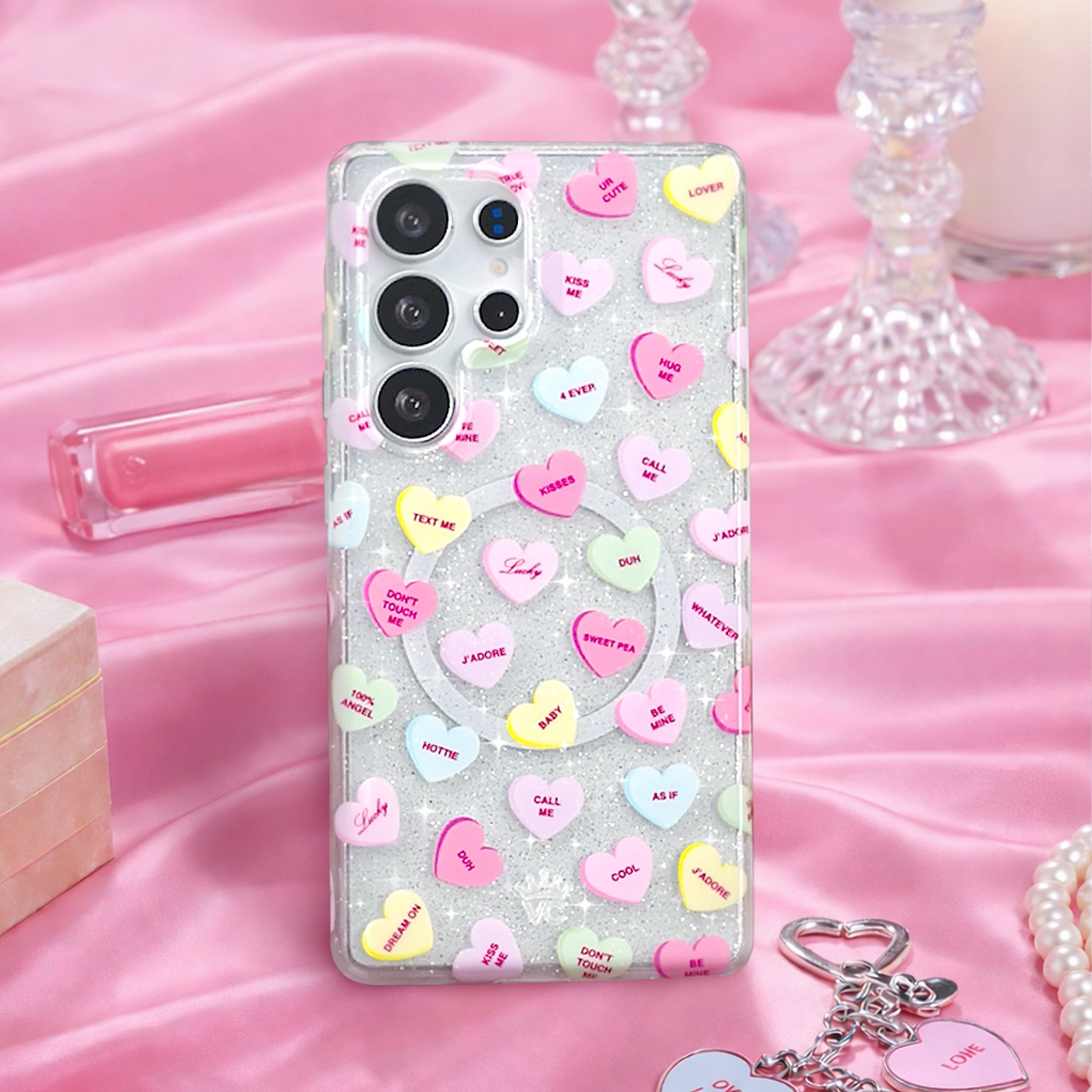 Sweet like candy! This Limited Edition protective case features candy-inspired conversation hearts on a clear base with silver glitter sprinkled into the base and bumper.