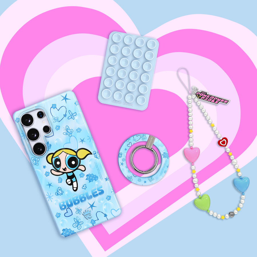 It's Bubbles! This glossy protective case features Bubbles front and center with bubbles, butterflies, and hearts sprinkled throughout all on a radiating heart background in various shades of blue.